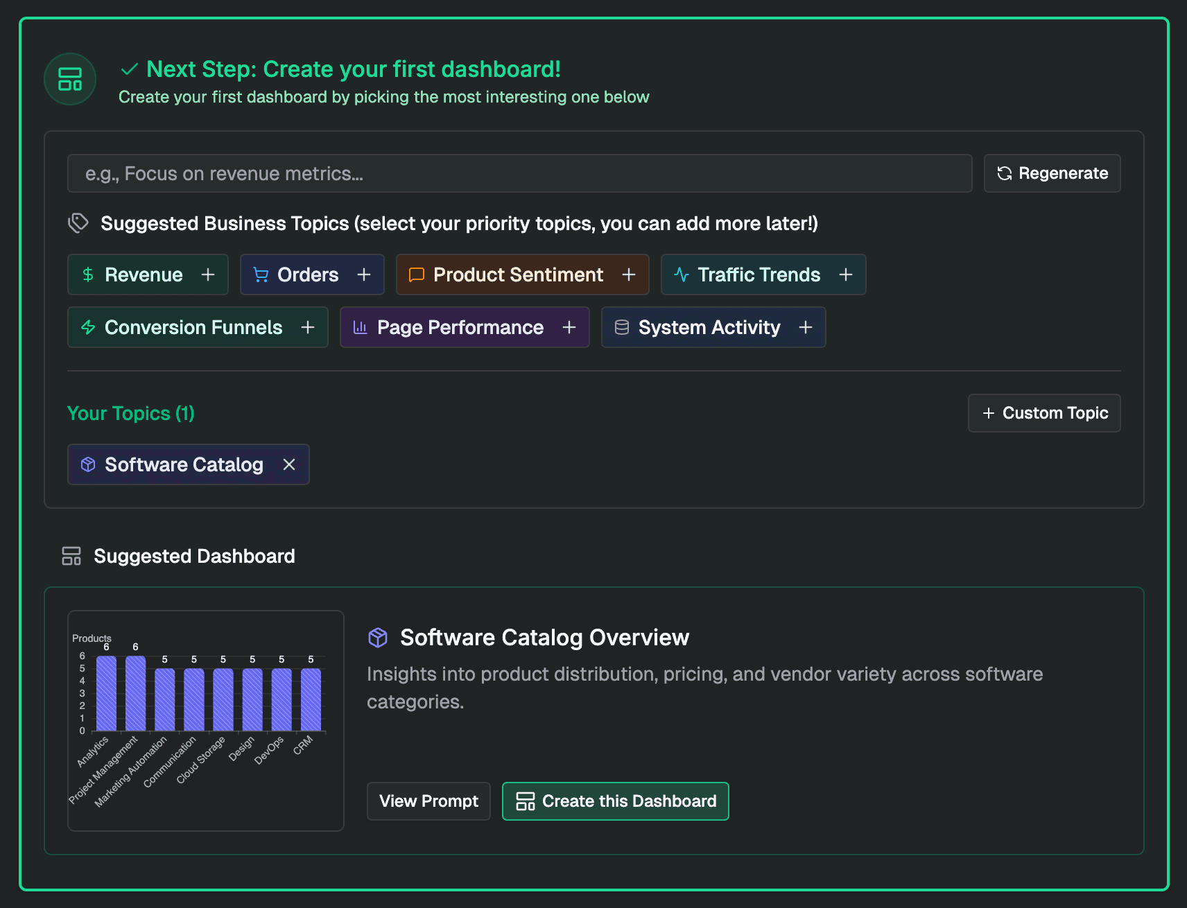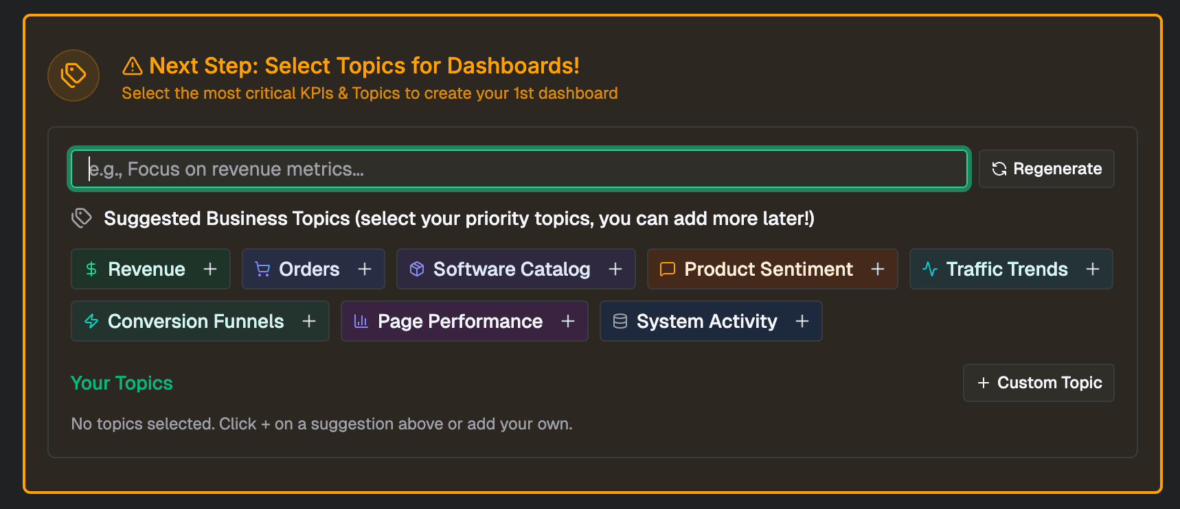 The final and most critical step in Onboarding is to create your first topics to power your first dashboard! Click to select your preferred topics and add a prompt to generate more! Then we'll build previews of your first dashboards and you can click to build your first full dashboard!